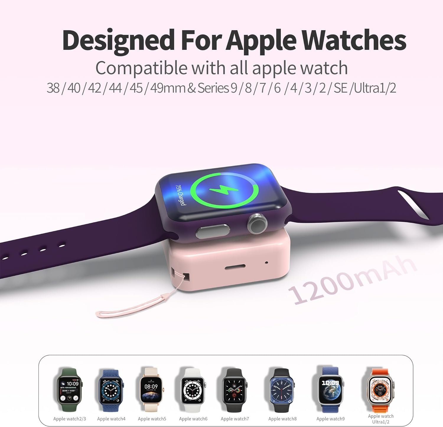 Chargeur portable pour Apple Watch Batterie avec charge rapide pour iWatch, banque d’alimentation magnétique sans fil compacte 1200 mAh avec porte-clés pour Apple Watch Series 9/8/7/6/5/4/3/2/SE/Ultra/Ultra2
