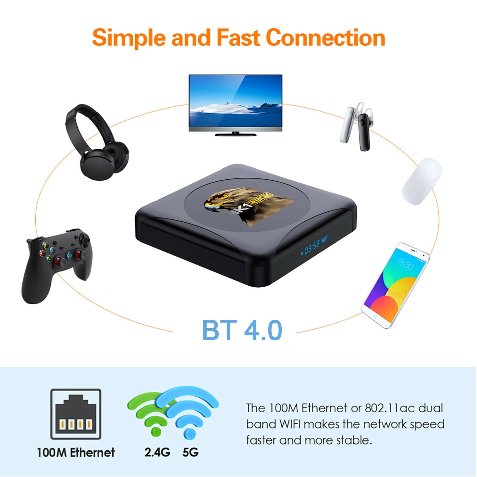 Prend en charge le WiFi double bande 2.4G/5G, les signaux WiFi stables et rapides. BT 5.0 prend en charge la connectivité sans fil, ce qui lui permet de se connecter rapidement aux appareils Bluetooth.