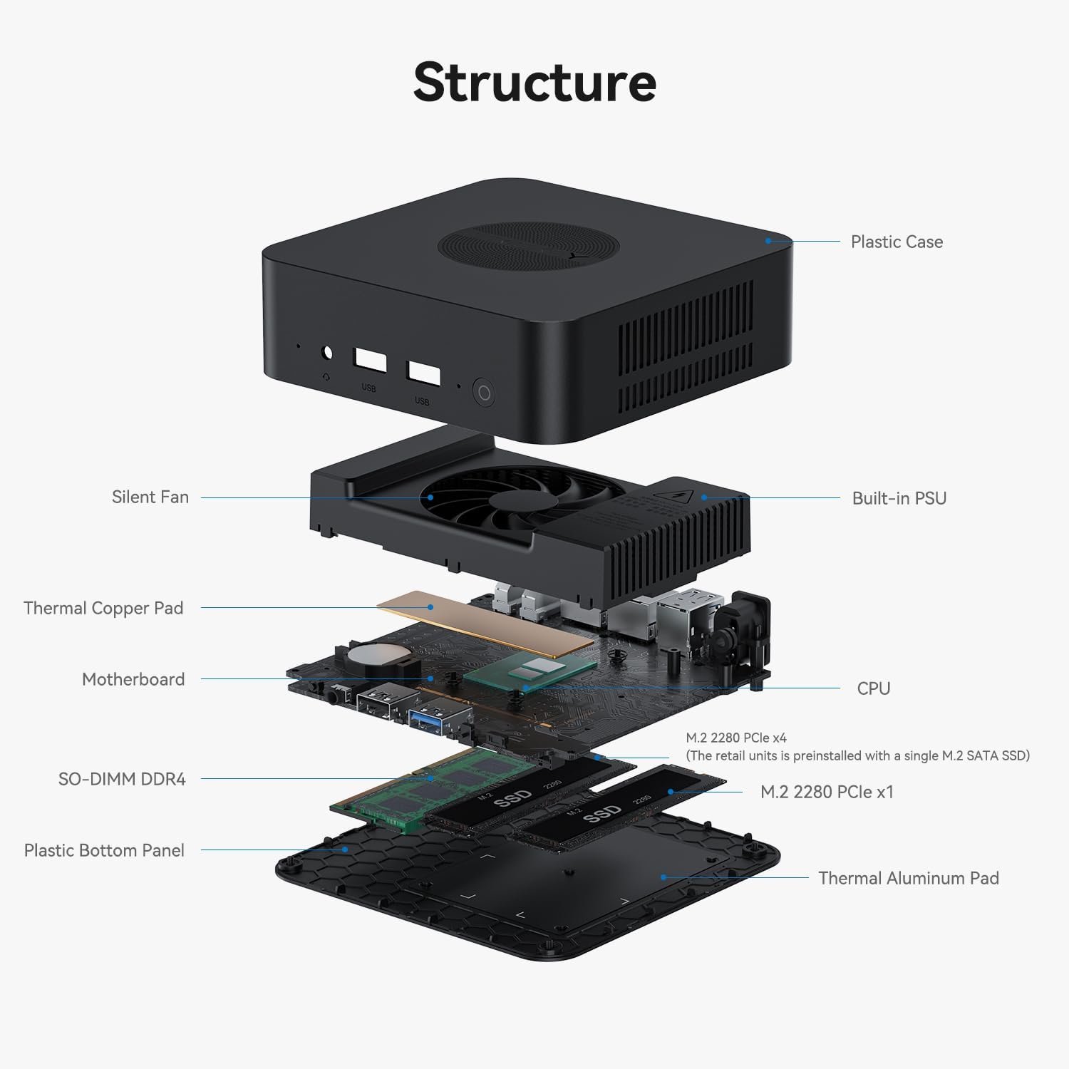 【16 Go DDR4 + SSD 500 Go】 Le mini-ordinateur Trigkey KEY N95 intègre 16 Go DDR4 3200 MHz (monocanal). Il prend en charge deux SSD M.2 2280 PCle. Le mini-ordinateur est équipé d’un SSD PCIE 3.0 x4 500 Go (compatible avec un SSD M.2 SATA III) et d’un autre SSD PCIE 3.0 x1 NVMe (non inclus).