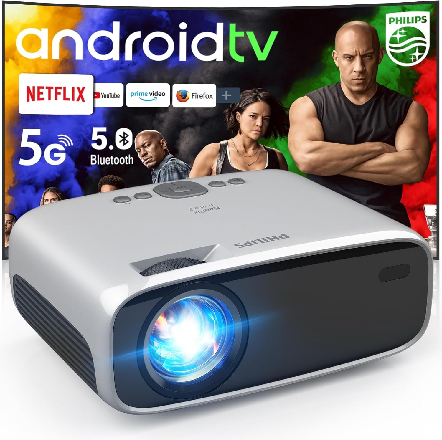 Video Projecteur TV Android PHILIPS Neopix Prime 2 Google TV avec des applications et WiFi 5G Bluetooth – Projecteur Smart; Netflix intégré, YouTube etc, projecteur de film intérieur/extérieur 4D 4P Keystone, Zoom, compatible avec iOS/Android/Xbox/PS4/TV Stick/HDMI